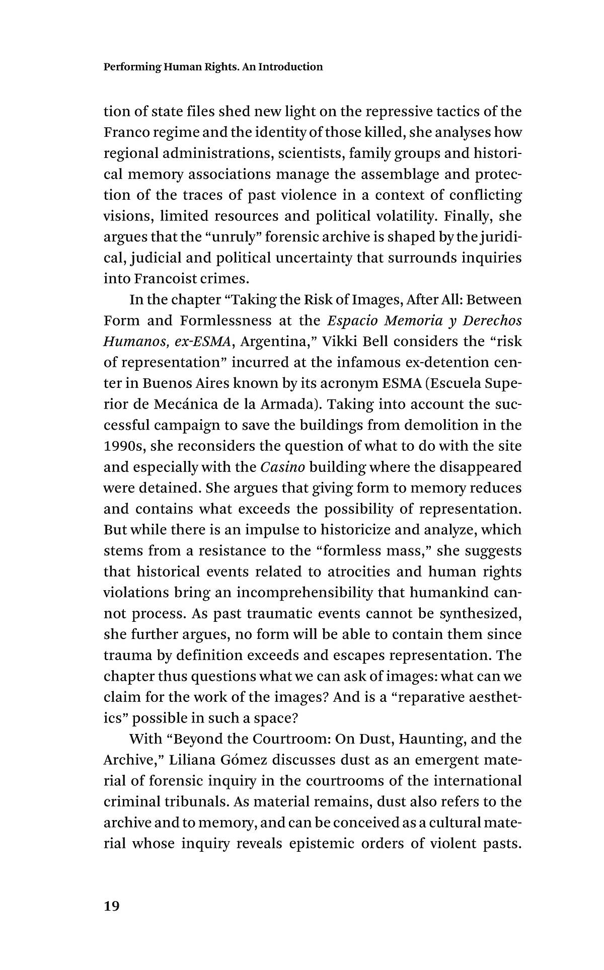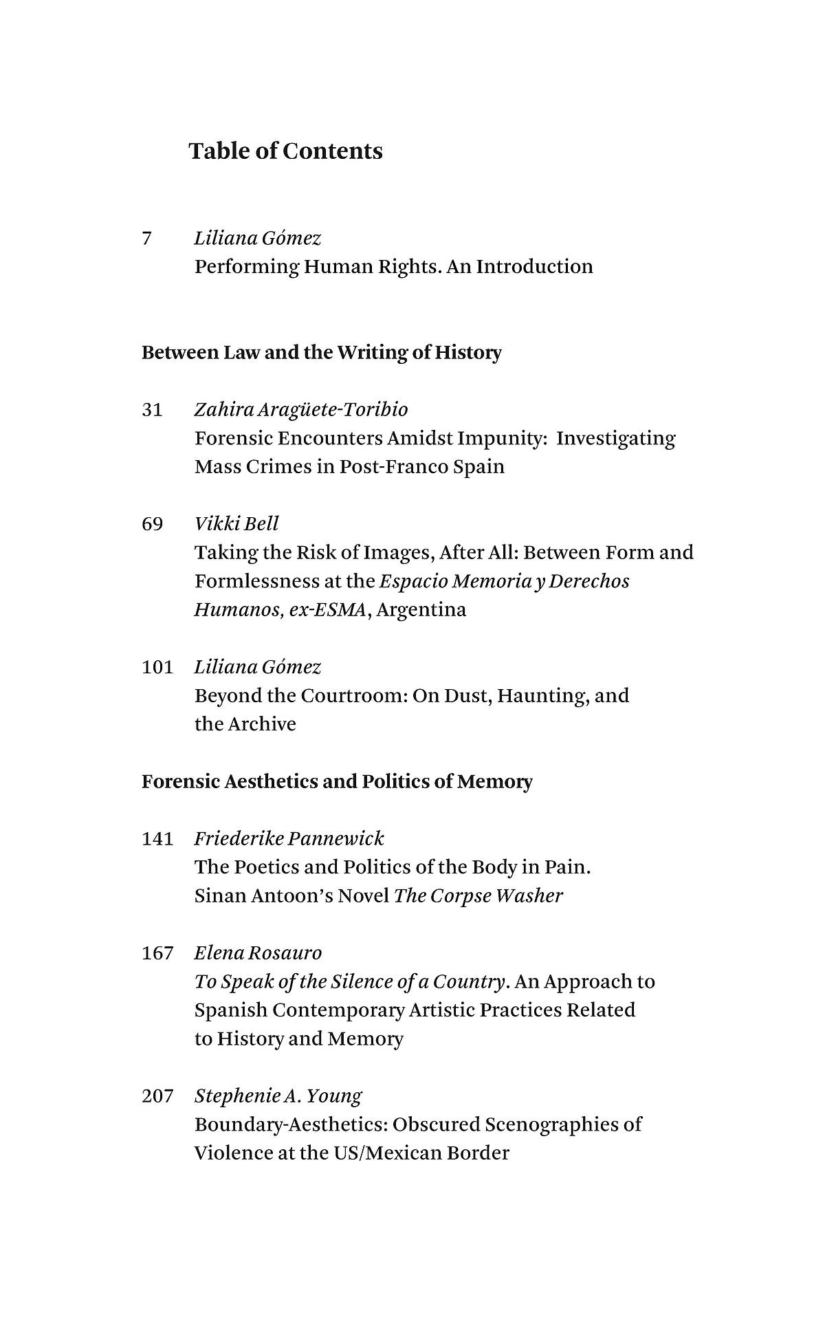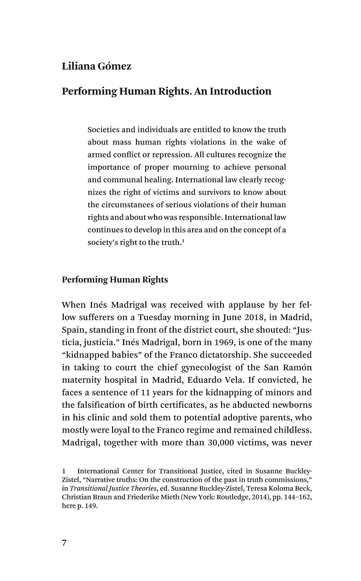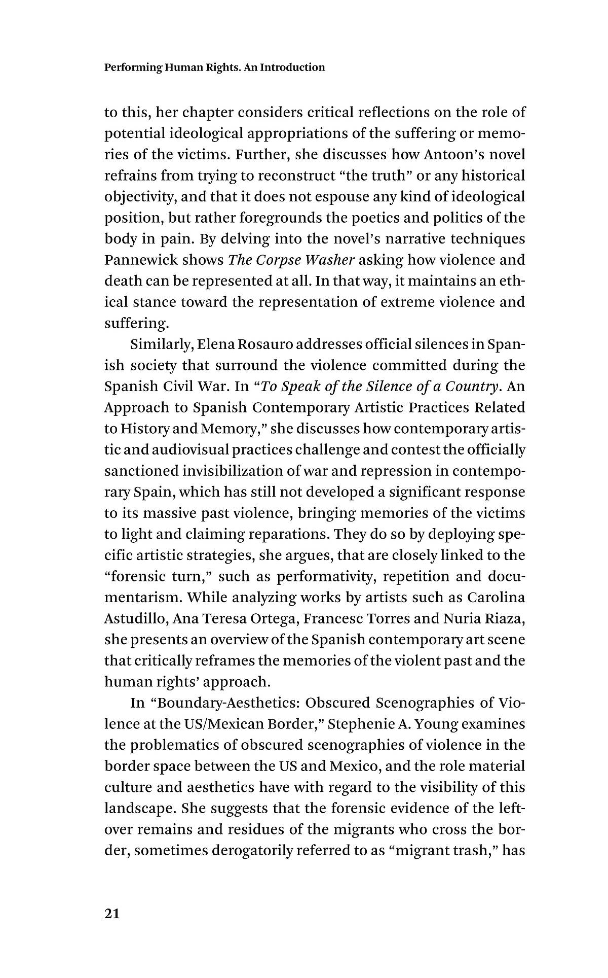 The invisibilization of political violence, its material traces and spatial manifestations, characterize (post)conflict situations. Yet counter-semantics and dissonant narratives that challenge this invisibility have been articulated by artists, writers, and human rights activists that increasingly seek to contest the related historical amnesia. Adopting “performance” as a concept that is defined by repetitive, aesthetic practices—such as speech and bodily habits through which both individual and collective identities are constructed and perceived (Susan Slyomovics)—this collection addresses various forms of performing human rights in transitional situations in Spain, Latin America, and the Middle East. Bringing scholars together with artists, writers, and curators, and working across a range of disciplines, Performing Human Rights addresses these instances of omission and neglect, revealing how alternate institutional spaces and strategies of cultural production have intervened in the processes of historical justice and collective memory.