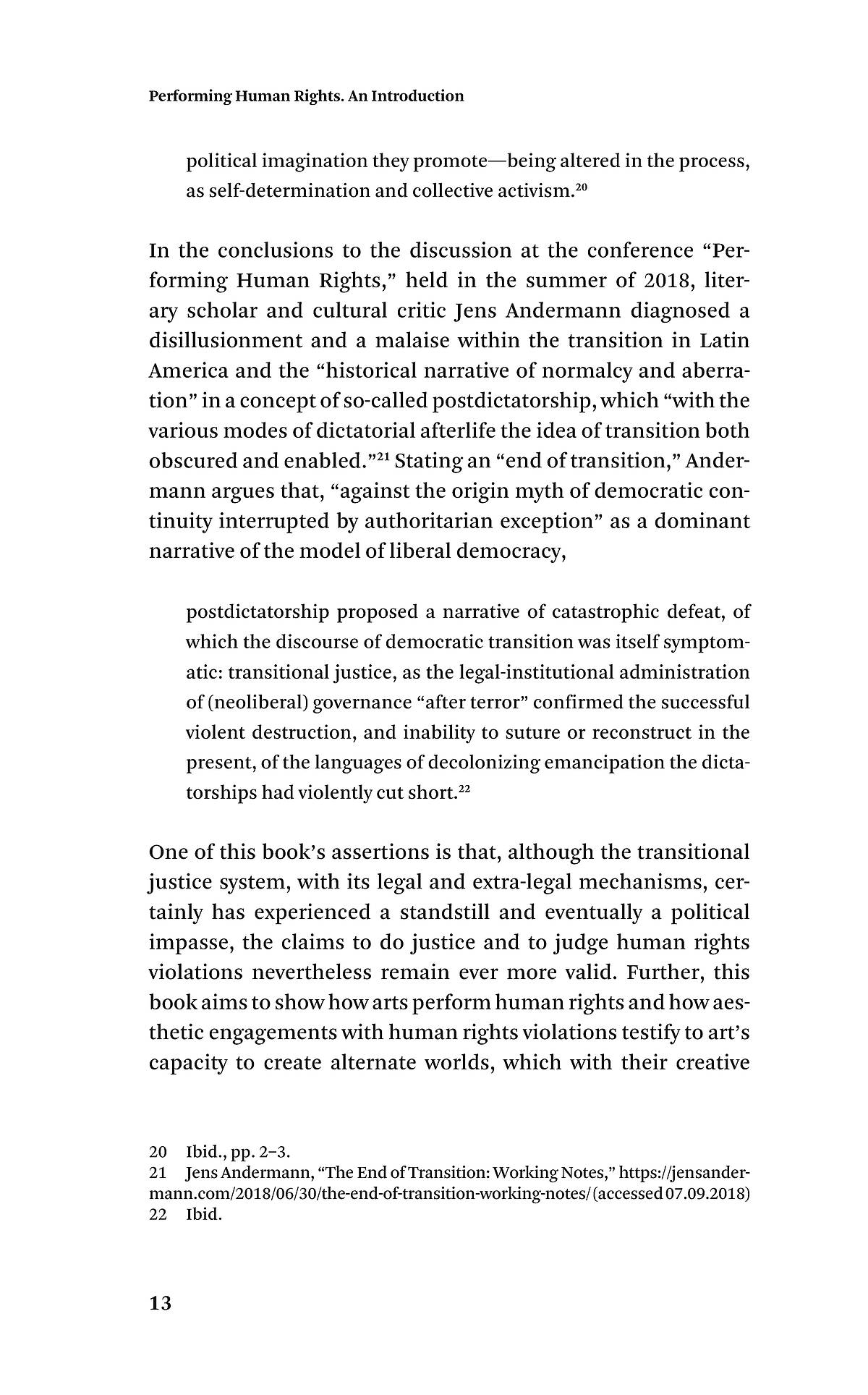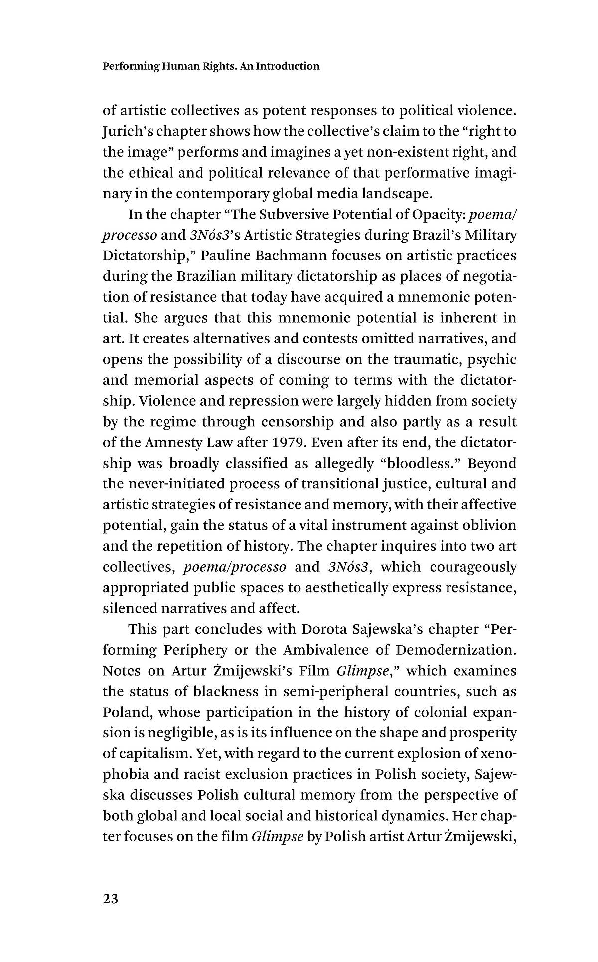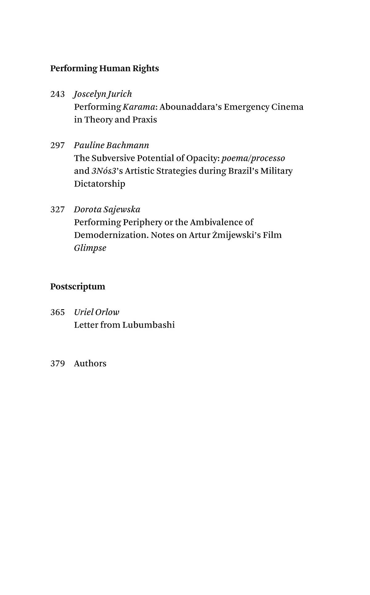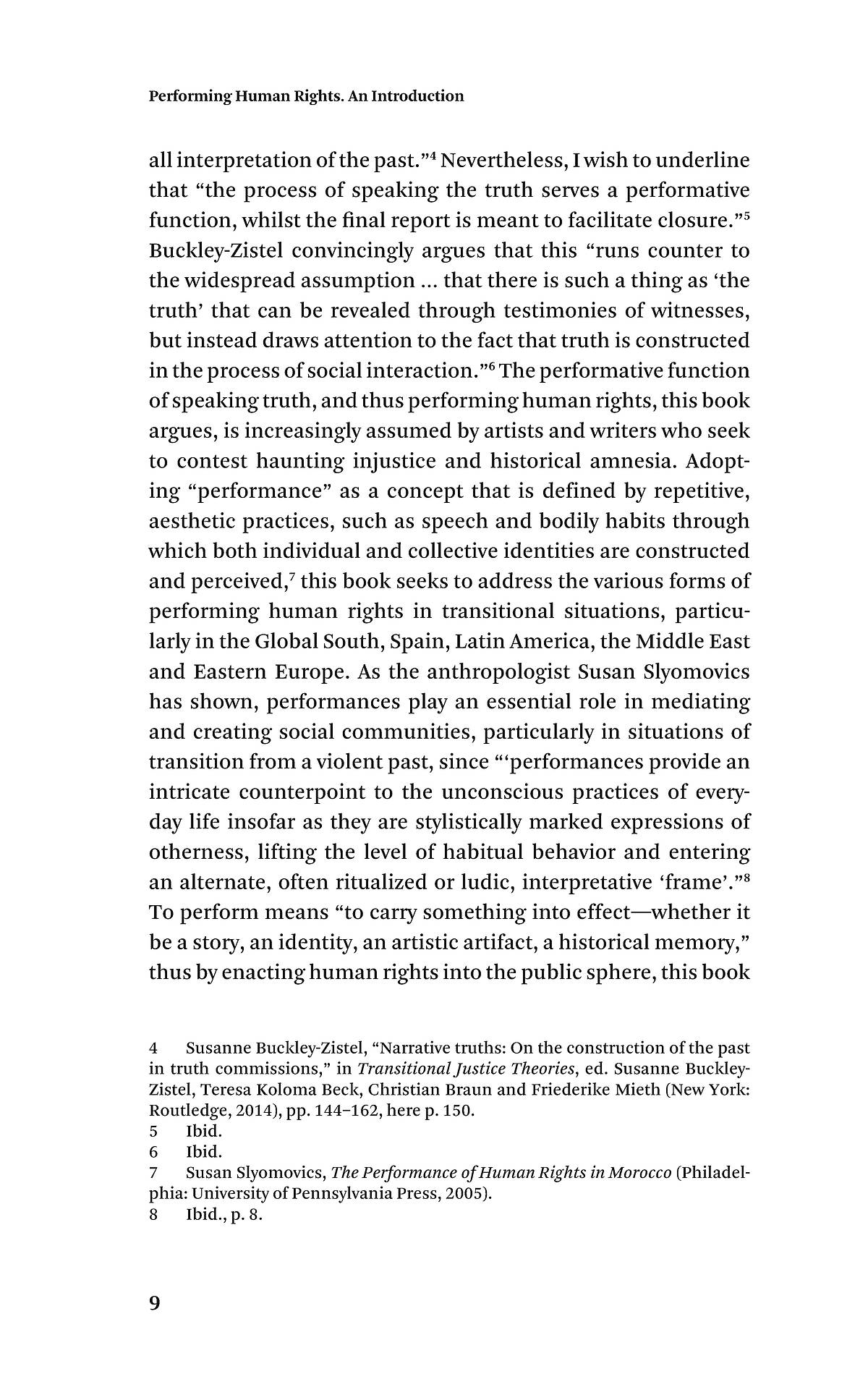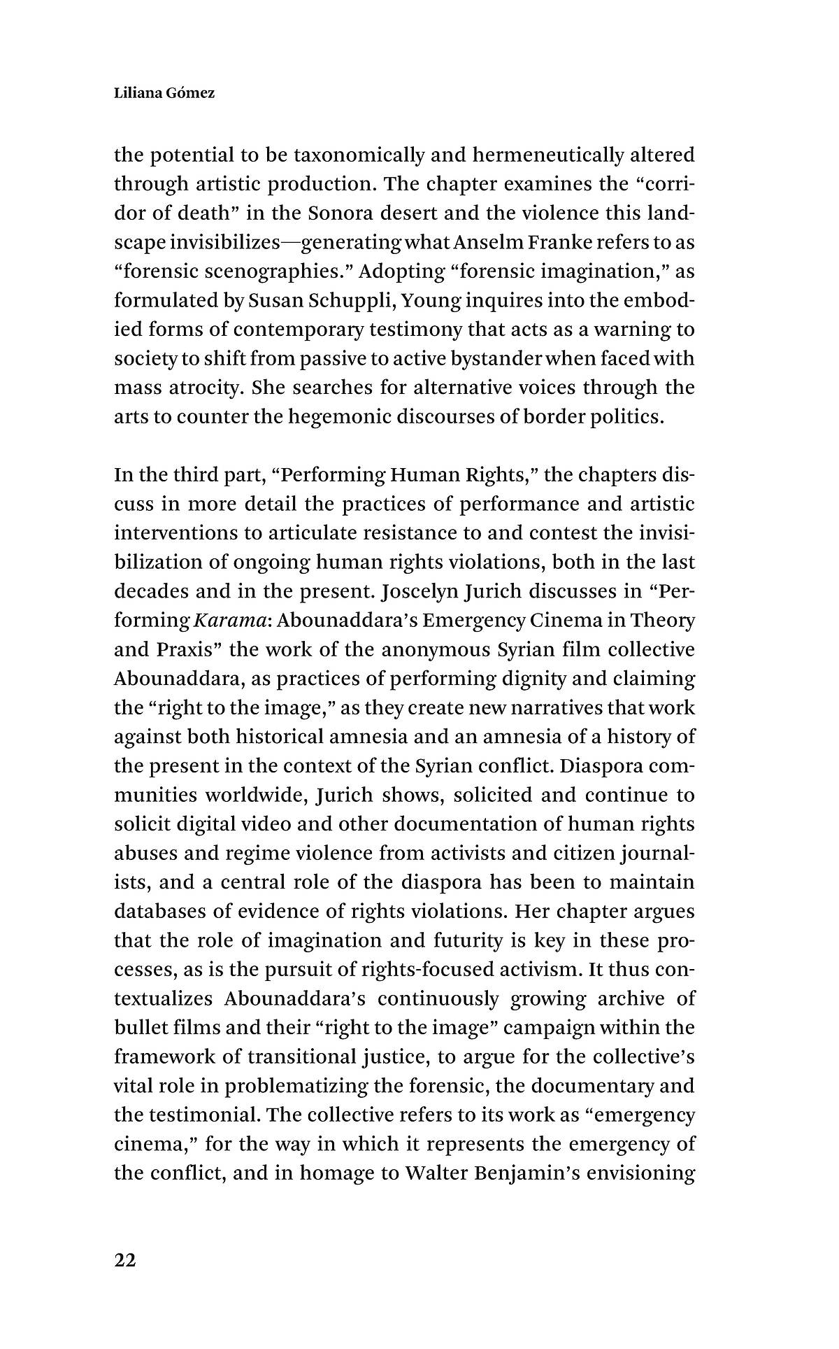 The invisibilization of political violence, its material traces and spatial manifestations, characterize (post)conflict situations. Yet counter-semantics and dissonant narratives that challenge this invisibility have been articulated by artists, writers, and human rights activists that increasingly seek to contest the related historical amnesia. Adopting “performance” as a concept that is defined by repetitive, aesthetic practices—such as speech and bodily habits through which both individual and collective identities are constructed and perceived (Susan Slyomovics)—this collection addresses various forms of performing human rights in transitional situations in Spain, Latin America, and the Middle East. Bringing scholars together with artists, writers, and curators, and working across a range of disciplines, Performing Human Rights addresses these instances of omission and neglect, revealing how alternate institutional spaces and strategies of cultural production have intervened in the processes of historical justice and collective memory.