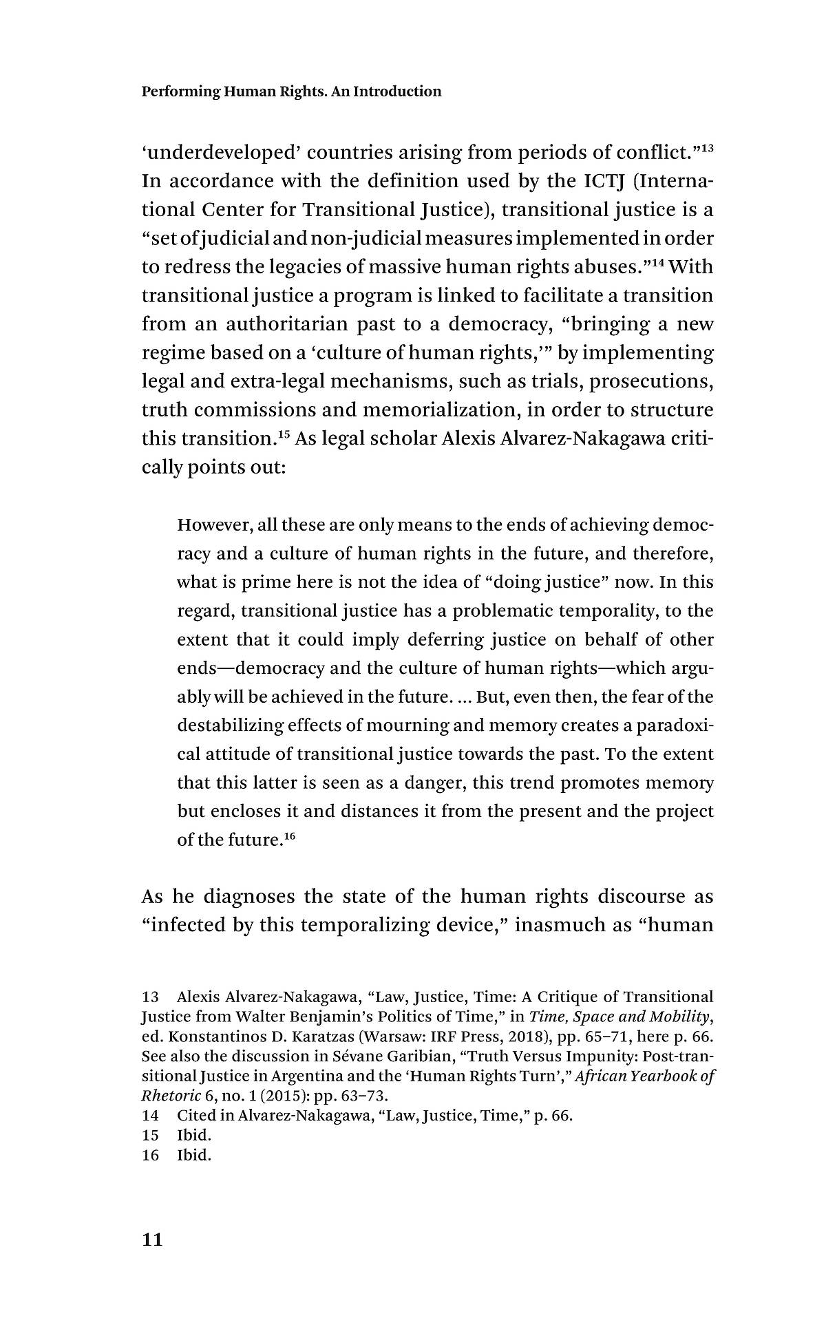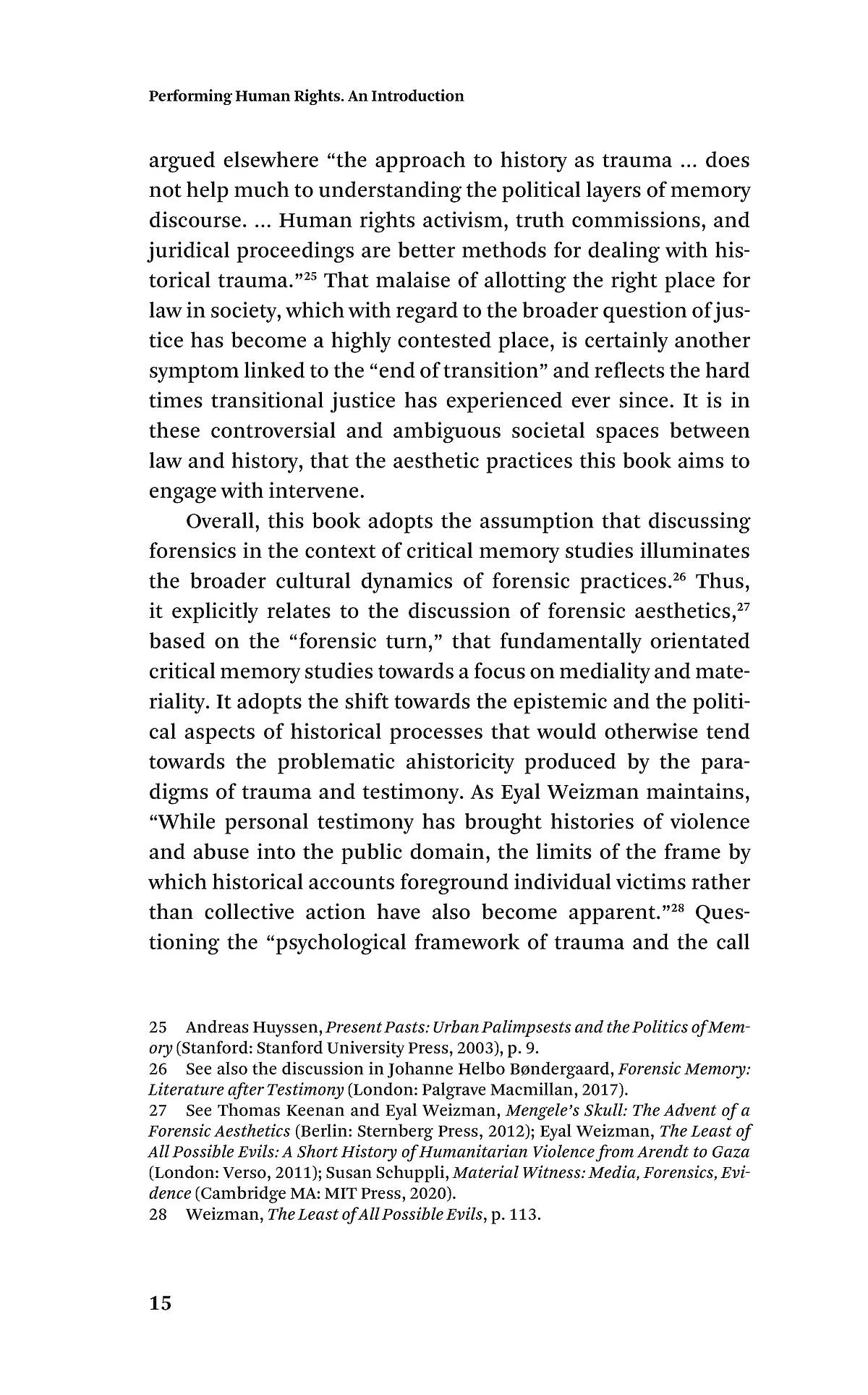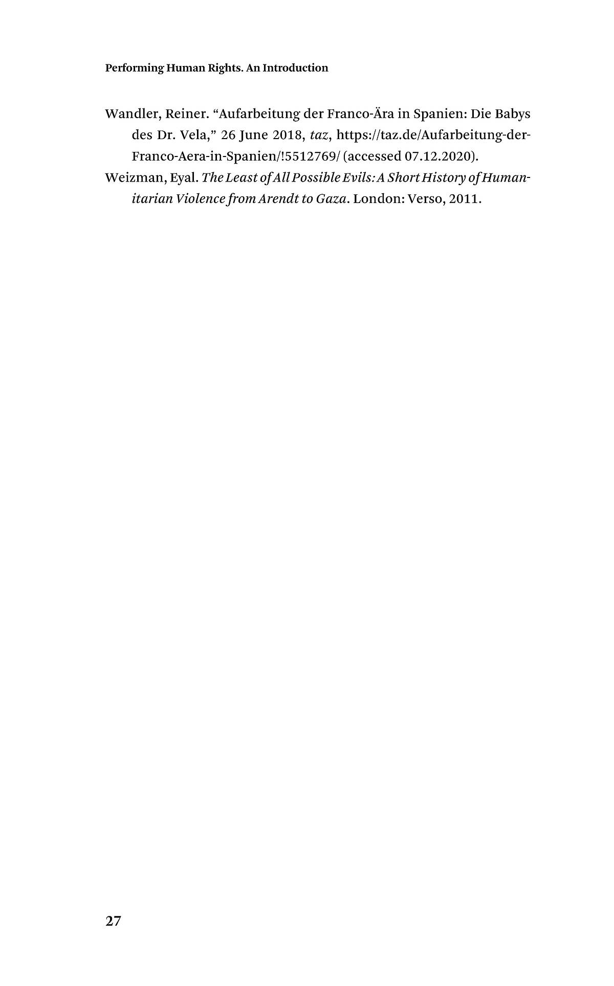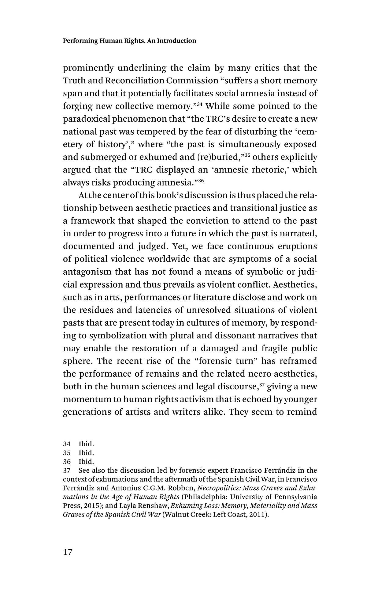 The invisibilization of political violence, its material traces and spatial manifestations, characterize (post)conflict situations. Yet counter-semantics and dissonant narratives that challenge this invisibility have been articulated by artists, writers, and human rights activists that increasingly seek to contest the related historical amnesia. Adopting “performance” as a concept that is defined by repetitive, aesthetic practices—such as speech and bodily habits through which both individual and collective identities are constructed and perceived (Susan Slyomovics)—this collection addresses various forms of performing human rights in transitional situations in Spain, Latin America, and the Middle East. Bringing scholars together with artists, writers, and curators, and working across a range of disciplines, Performing Human Rights addresses these instances of omission and neglect, revealing how alternate institutional spaces and strategies of cultural production have intervened in the processes of historical justice and collective memory.