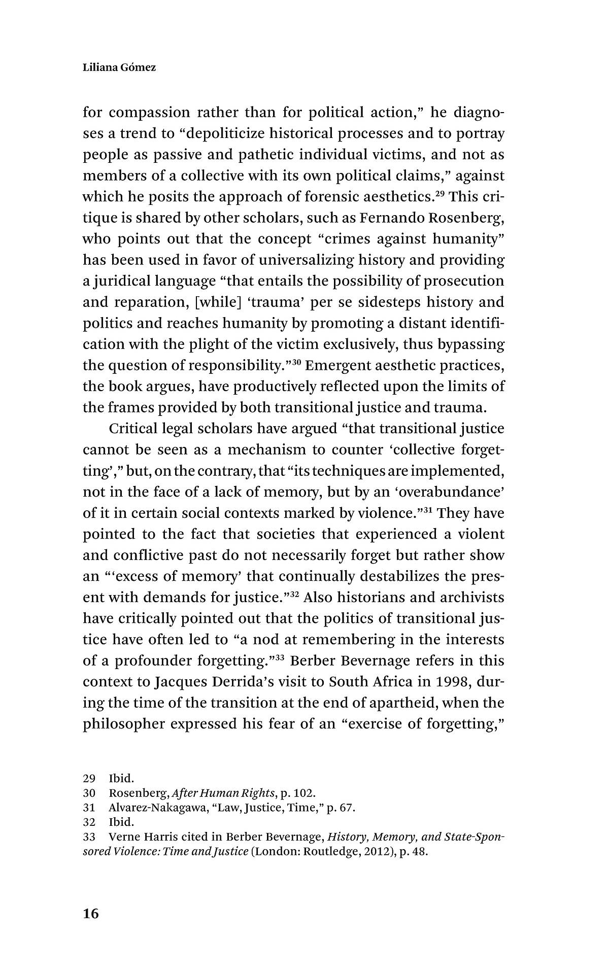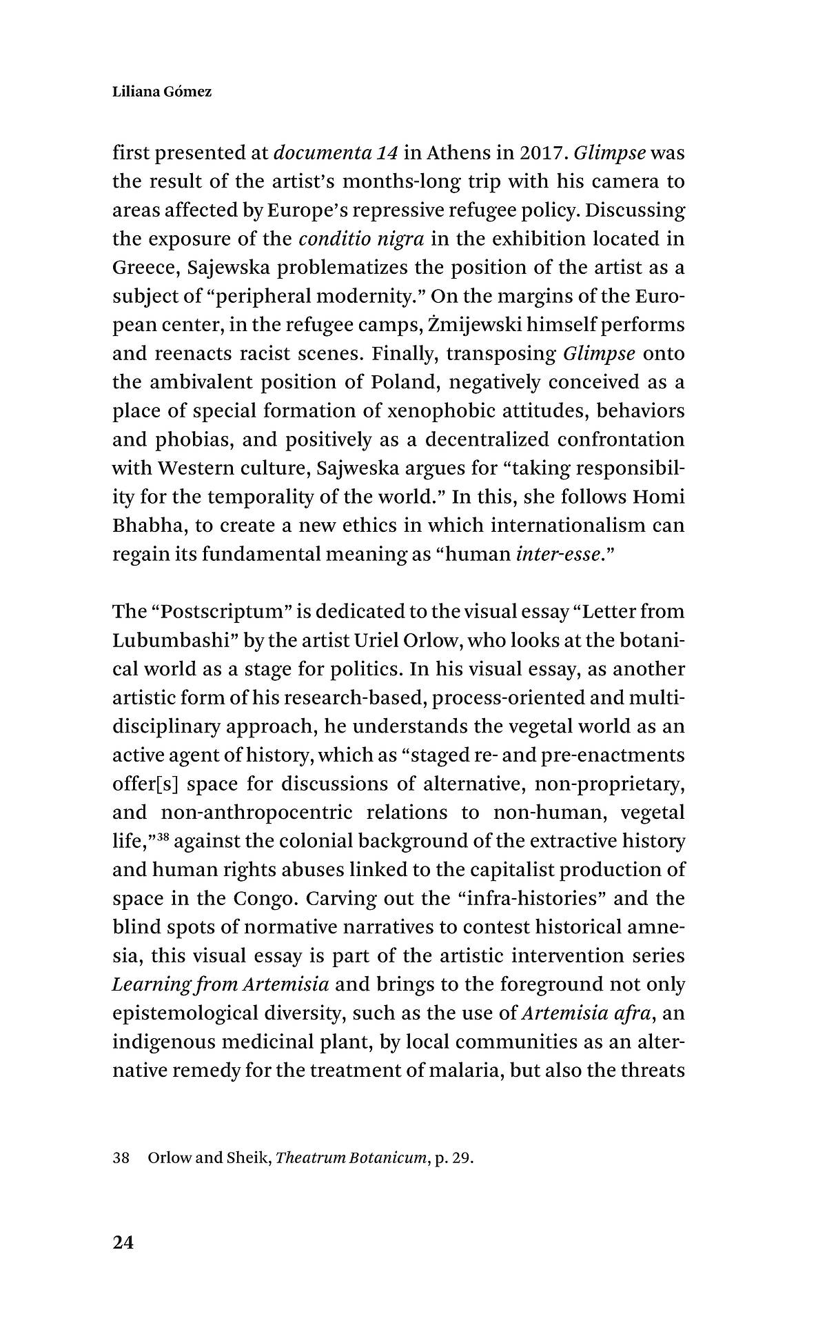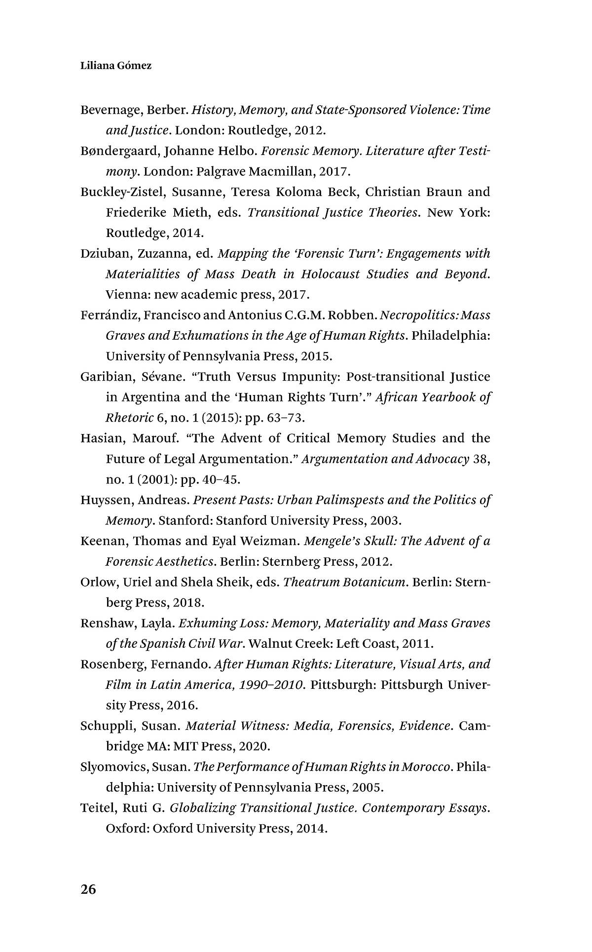 Liliana Gómez ist Professorin an der Kunsthochschule Kassel und dem documenta Institut. Sie leitet das Forschungsprojekt "Contested Amnesia and Dissonant Narratives in the Global South: Post-Conflict in Literature, Art, and Emergent Archives", für das sie Förderung und die SNF-Förderungsprofessur vom Schweizerischen Nationalfond erhielt. Sie schreibt über Literatur-, Kultur- und Medientheorie der Gegenwart, Theorie und Geschichte der Moderne im besonderen mit Blick auf die Kunst, die Stadt und Botanik, Ästhetik und postkoloniale Studien, Memory Studies, Literatur, Kunst und Menschenrechte, die Visuellen Kulturen und environmental humanities. Kürzlich hat sie Performing Human Rights: Contested Amnesia and Aesthetic Practices in the Global South (diaphanes, 2021) herausgegeben und ist Mitherausgeberin von Liquid Ecologies in Latin American and Caribbean Art (Routledge, 2020). Zudem ist sie Autorin von Archive Matter: A Camera in the Laboratory of the Modern (diaphanes, 2023) Chefredakteurin des Magazins Latin American and Latinx Visual Culture.
