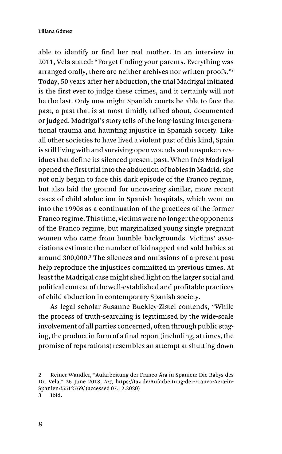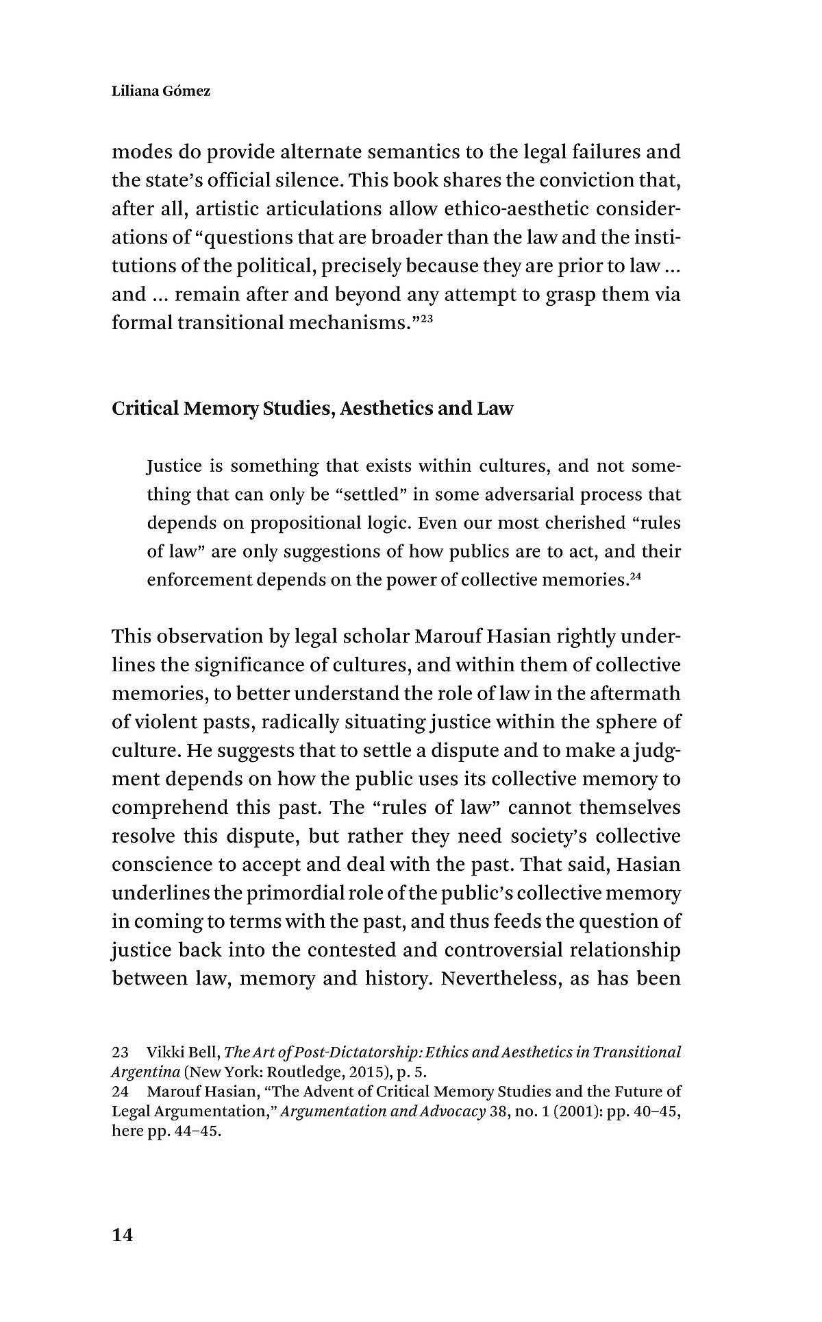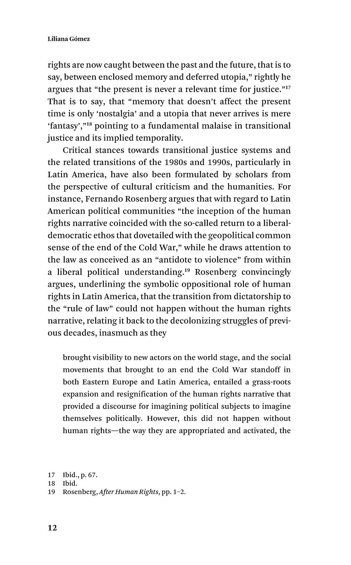 Liliana Gómez ist Professorin an der Kunsthochschule Kassel und dem documenta Institut. Sie leitet das Forschungsprojekt "Contested Amnesia and Dissonant Narratives in the Global South: Post-Conflict in Literature, Art, and Emergent Archives", für das sie Förderung und die SNF-Förderungsprofessur vom Schweizerischen Nationalfond erhielt. Sie schreibt über Literatur-, Kultur- und Medientheorie der Gegenwart, Theorie und Geschichte der Moderne im besonderen mit Blick auf die Kunst, die Stadt und Botanik, Ästhetik und postkoloniale Studien, Memory Studies, Literatur, Kunst und Menschenrechte, die Visuellen Kulturen und environmental humanities. Kürzlich hat sie Performing Human Rights: Contested Amnesia and Aesthetic Practices in the Global South (diaphanes, 2021) herausgegeben und ist Mitherausgeberin von Liquid Ecologies in Latin American and Caribbean Art (Routledge, 2020). Zudem ist sie Autorin von Archive Matter: A Camera in the Laboratory of the Modern (diaphanes, 2023) Chefredakteurin des Magazins Latin American and Latinx Visual Culture.